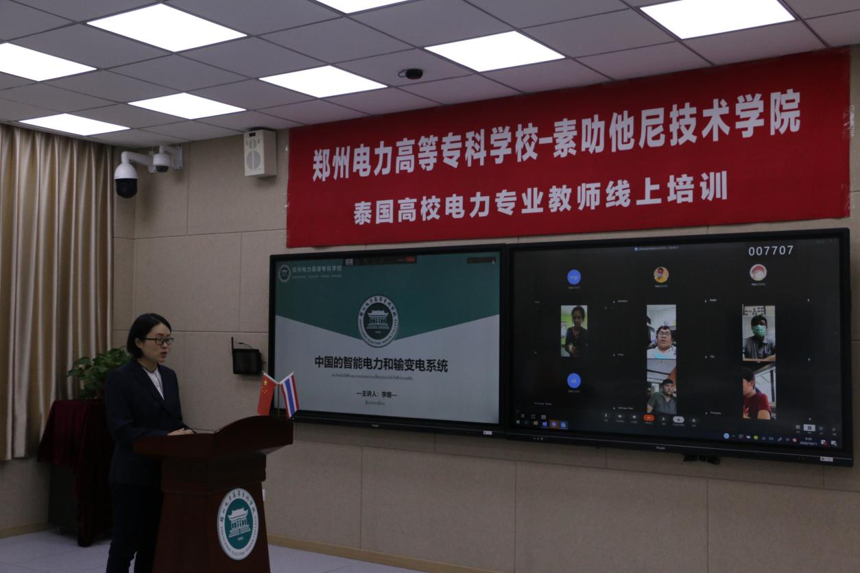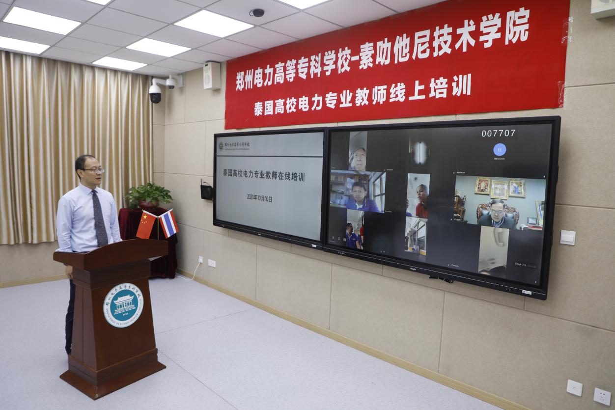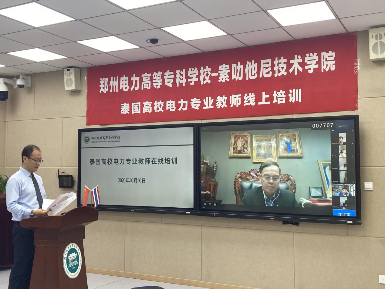 10月10日上午在教学楼二区102智慧教室举办了44118太阳成城集团-泰国素叻他尼技术学院电力专业教师线上培训启动仪式。胡斌副董事长和泰国素叻他尼技术学院主席诗拉伟先生参加了开班仪式并分别致辞。泰国参培高校教师来自素叻他尼技术学院18人、渊沙工业和社区学院3人、萨拉特理工学院2人、差也工业和社区教育学院4人、干乍那迪技术学院1人,共计28人。